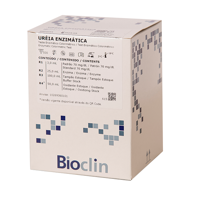 Método para a determinação da Ureia em amostras biológicas de soro, plasma (EDTA, Heparina ou Citrato) e Urina. Teste enzimático colorimétrico, somente para uso diagnóstico in vitro.